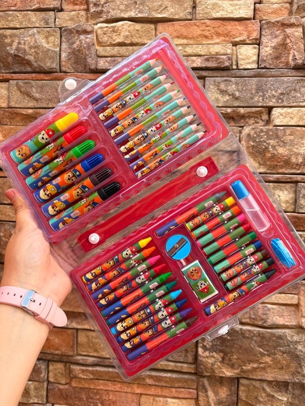 Incluye lápices de colores, fibras, crayones, goma, sacapuntas, pegamento y clips.
